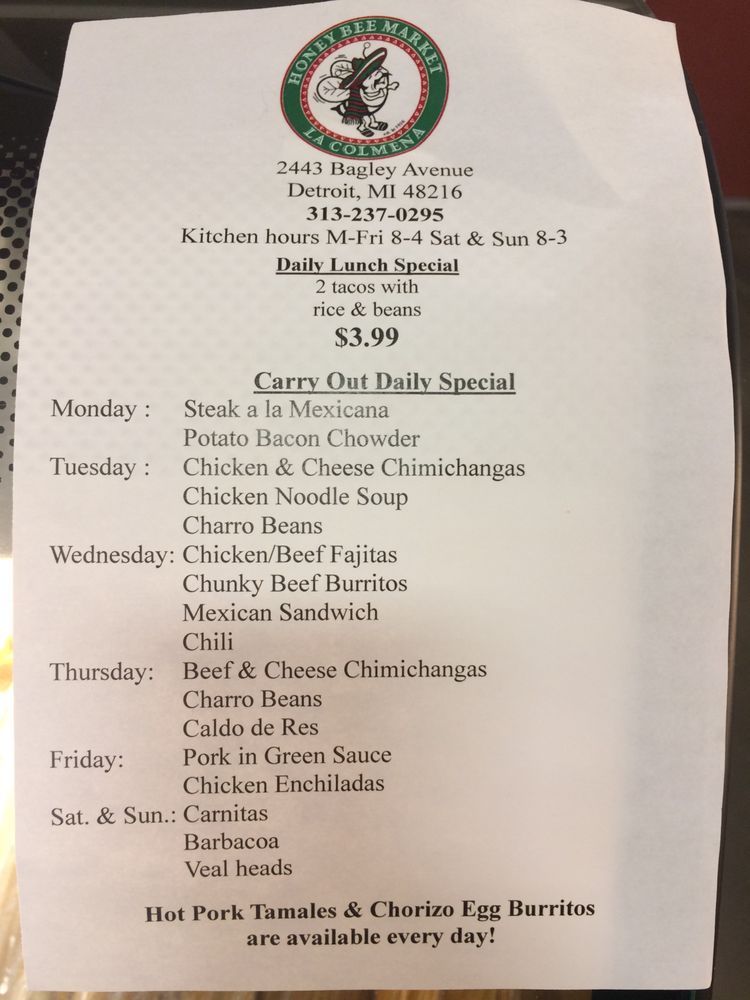 Honey Bee La Colmena in Detroit offers authentic Mexican cuisine with a diverse menu. Known for their delicious breakfast burritos, particularly the chorizo option, the flavors are top-notch and satisfying. The market also provides utensils for Mexican cooking, catering to those looking to recreate traditional dishes at home. With positive reviews from customers praising the tamales and overall variety of Latin-inspired foods, Honey Bee La Colmena is a must-visit spot for Mexican food enthusiasts. The welcoming staff and convenient amenities like outdoor seating, Wi-Fi, and parking make dining here a pleasant experience. Additionally, their reputation for quality and quantity echoes the culinary traditions of Texas, making it a standout choice for those in search of flavorful and fulfilling meals.